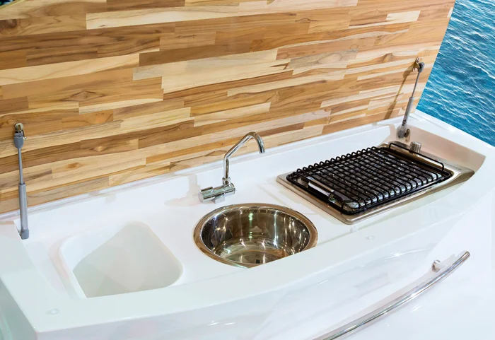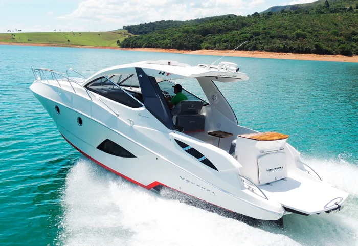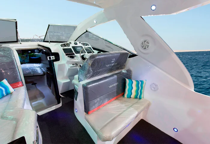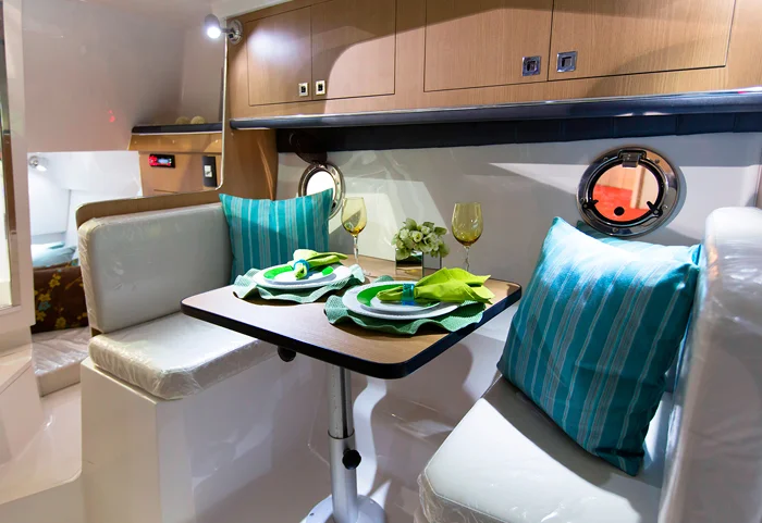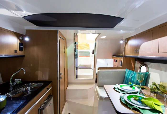 Única embarcação do mercado com cozinha interna que comporta instalação de geladeira, micro-ondas, fogão elétrico e adega de vinhos