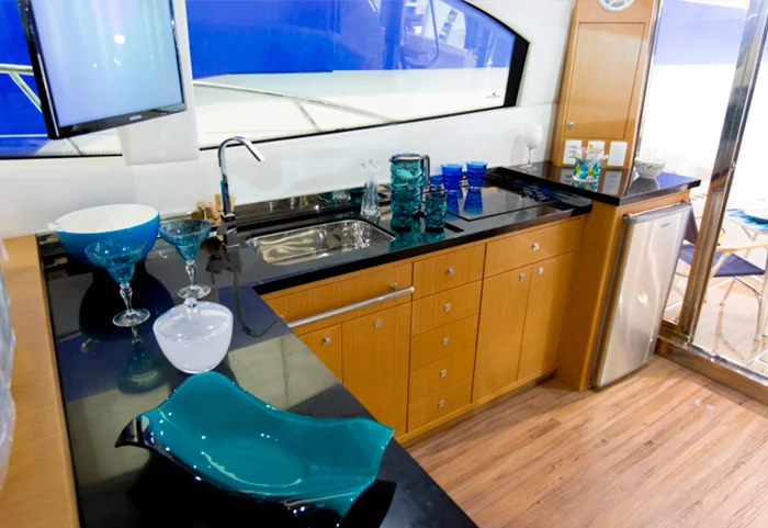 A resina isoftálica top-quality é usada nas demais camadas do processo de laminação. Painéis do tipo sanduíche (fibra de vidro + divinicel + fibra de vidro) são empregados nos costados, convés, deck e casaria (proporciona maior resistência com menor peso). As anteparas são feitas em compensado naval e painéis sanduíche com espuma expandida. O casco é do tipo “V” profundo.